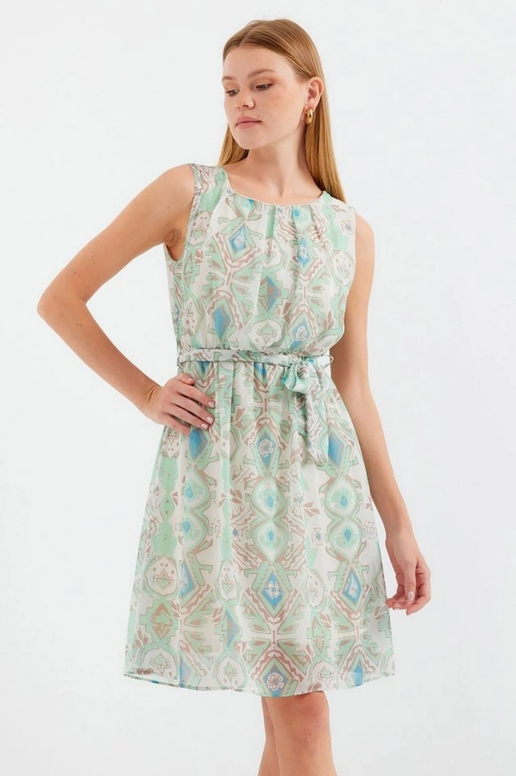 2501 Desenli Sıfır Kol Şifon Elbise - Mint