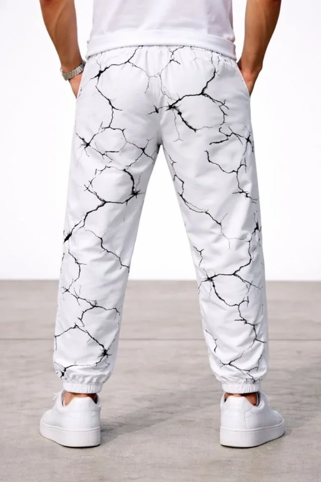 Erkek Dijital Baskılı Eşofman Altı Kışlık Üç İplik Şardonlu Kumaş Lastikli Paça, Cepli, Rahat Kalıp - Beyaz