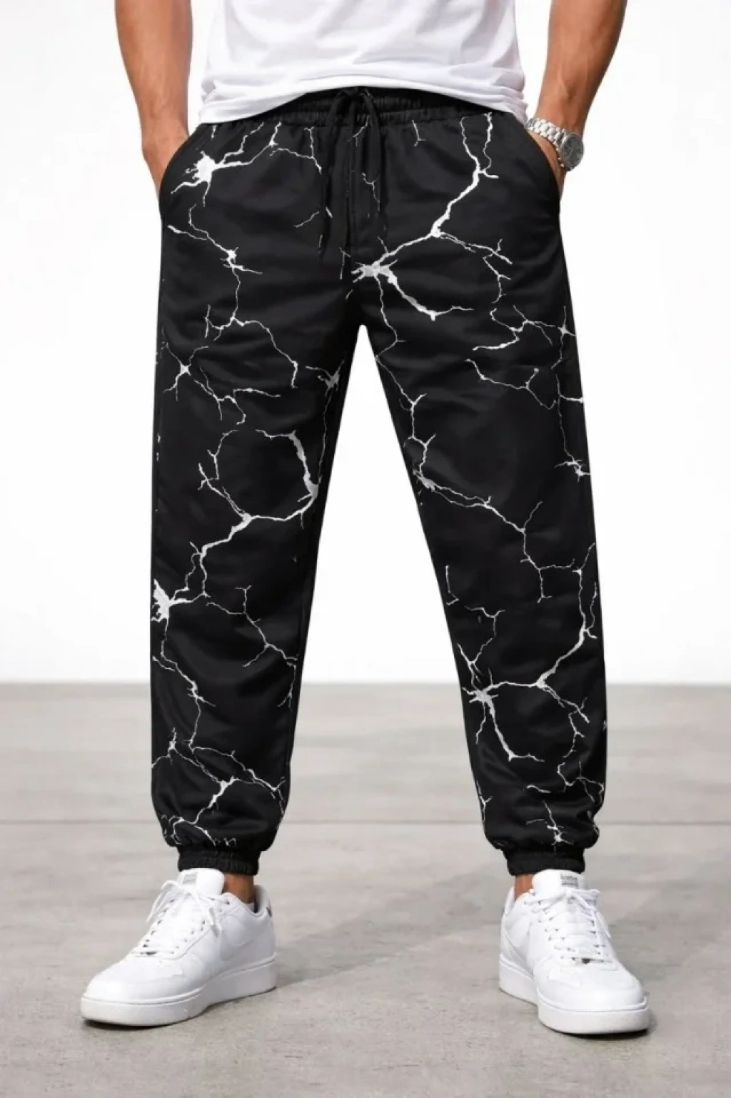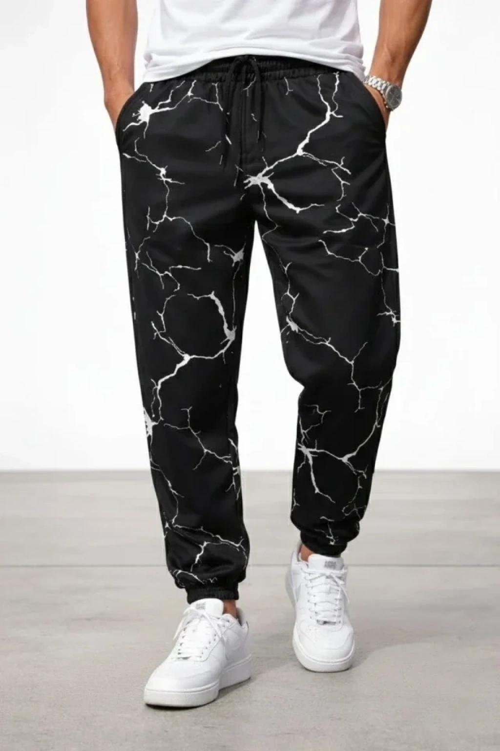 Erkek Dijital Baskılı Eşofman Altı Kışlık Üç İplik Şardonlu Kumaş Lastikli Paça, Cepli, Rahat Kalıp - Siyah