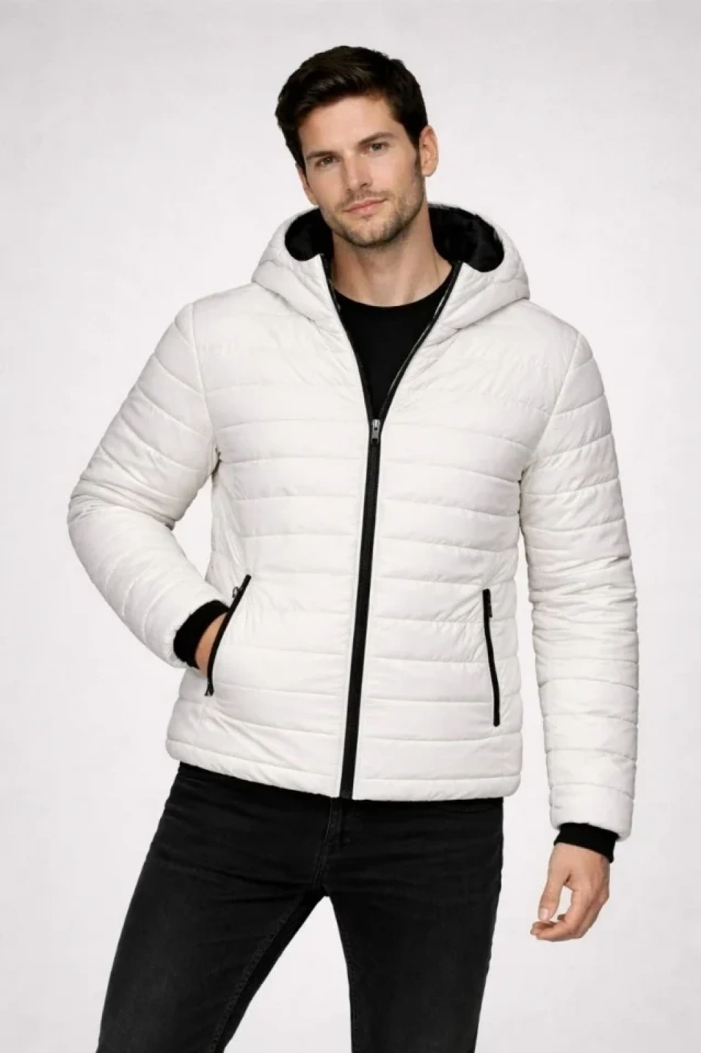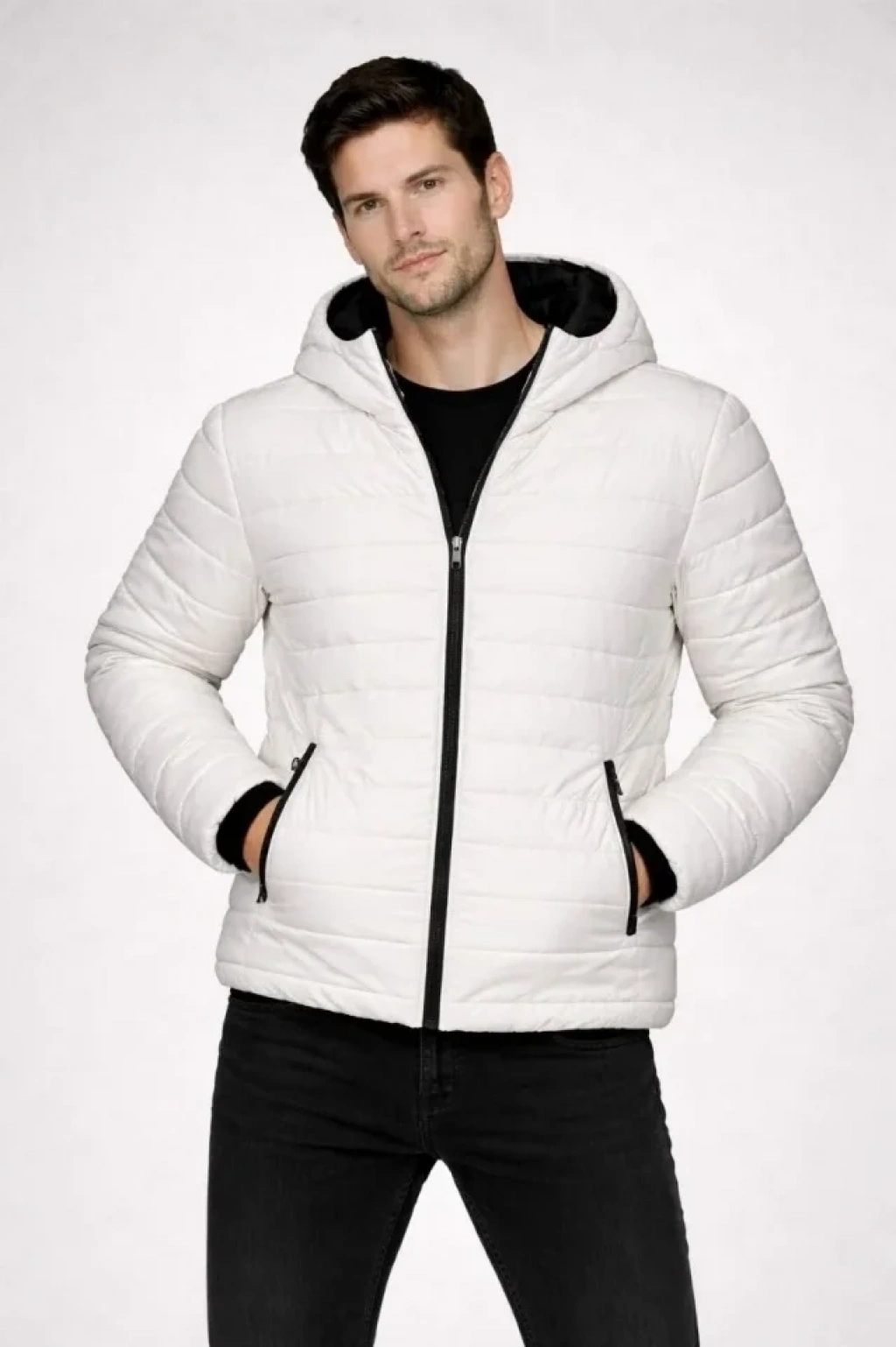 Erkek Şişme Kapüşonlu Fermuarlı Mont Su Itici Kapitone Astarlı Kumaş Cepli Kışlık Rahat Kalıp - Krem