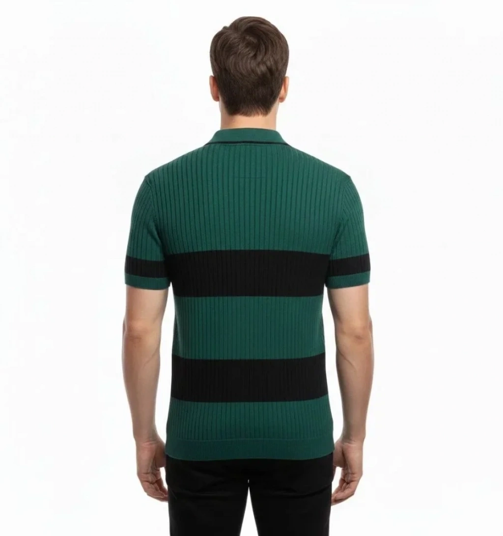 Erkek T-shirt Çizgili Triko Dokuma Kumaş Polo Yaka Yarım Fermuarlı Regular Kalıp Tişört - Çağla Yeşili