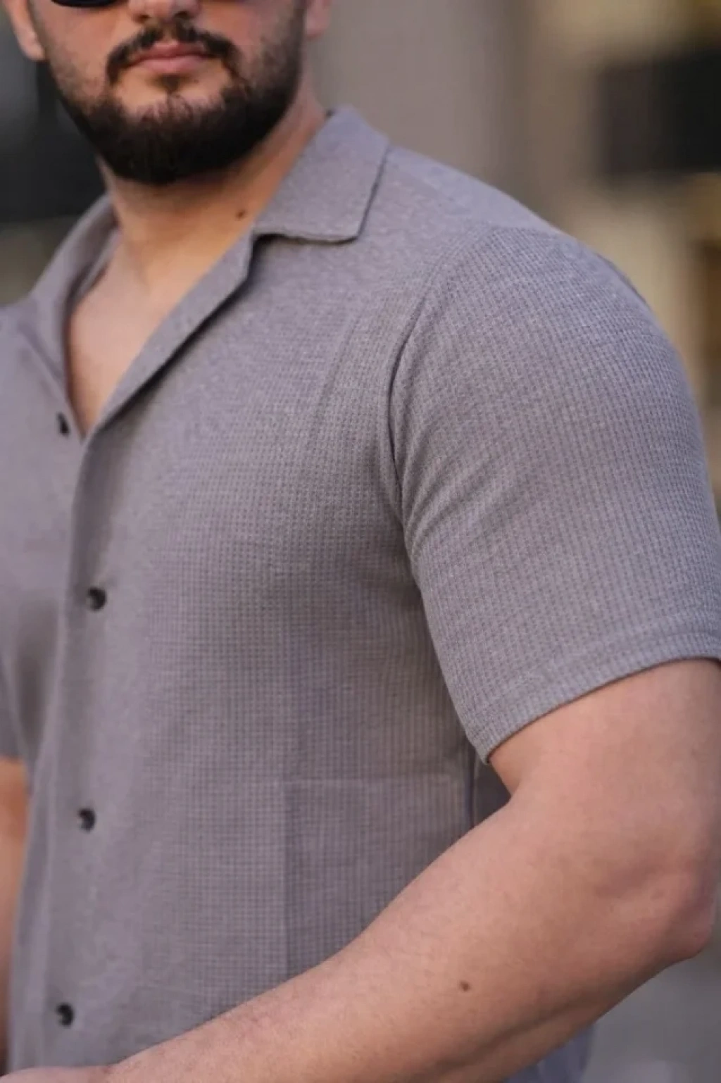 Erkek Waffle Dokuma Açık Yakalı Düğmeli Regular Kalıp 2’li Gömlek Seti - Lacivert - Gri