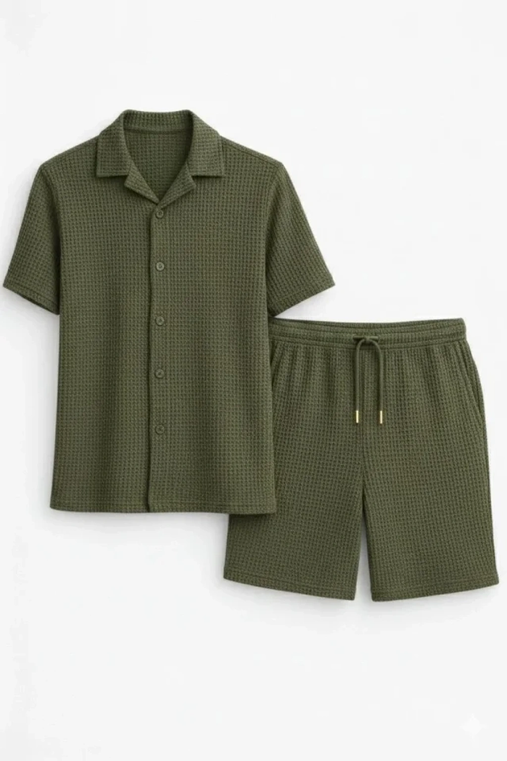 Erkek Waffle Kumaş Kısa Kollu Gömlek Şort Takım Regular Fit Yazlık İkili Set - Haki