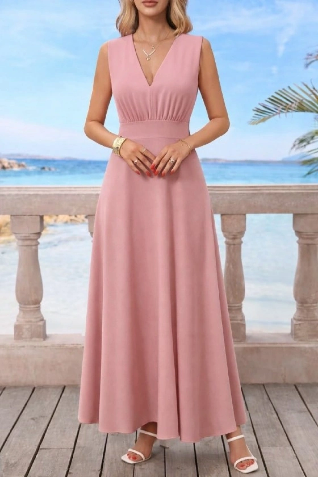 Kadın Askılı V Yakalı Bel Korsaj Detaylı Uzun Ithal Krep Elbise