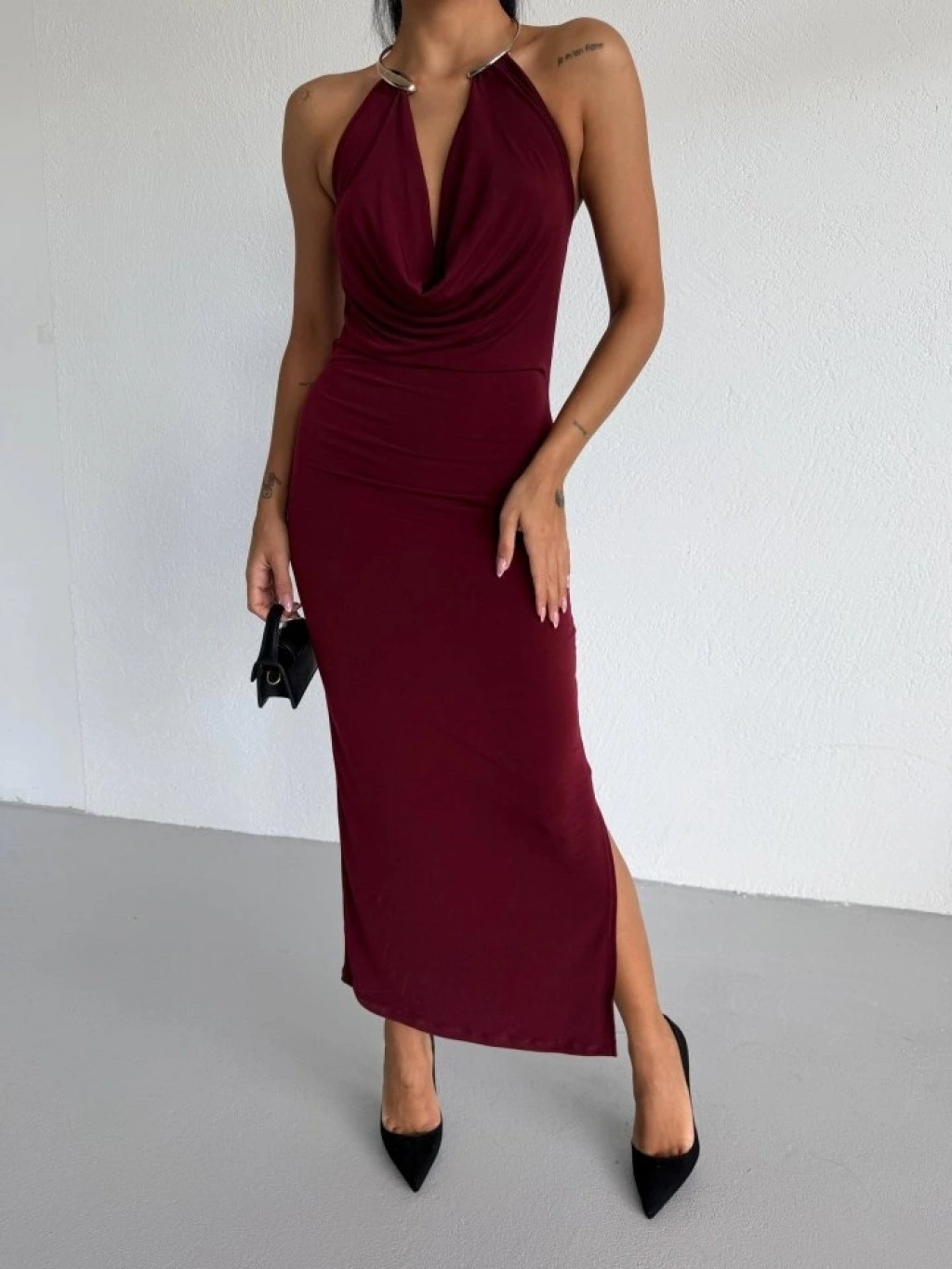 Kadın Boyun Aksesuarlı Halter Yaka Maxi Boy Sandy Kumaş Elbise