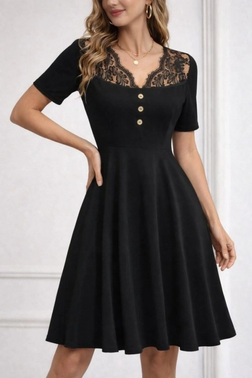 Kadın Kısa Kollu Dantel V Yakalı Düğmeli Kısa Janjan Krep Elbise