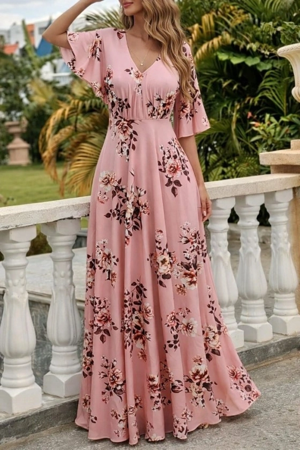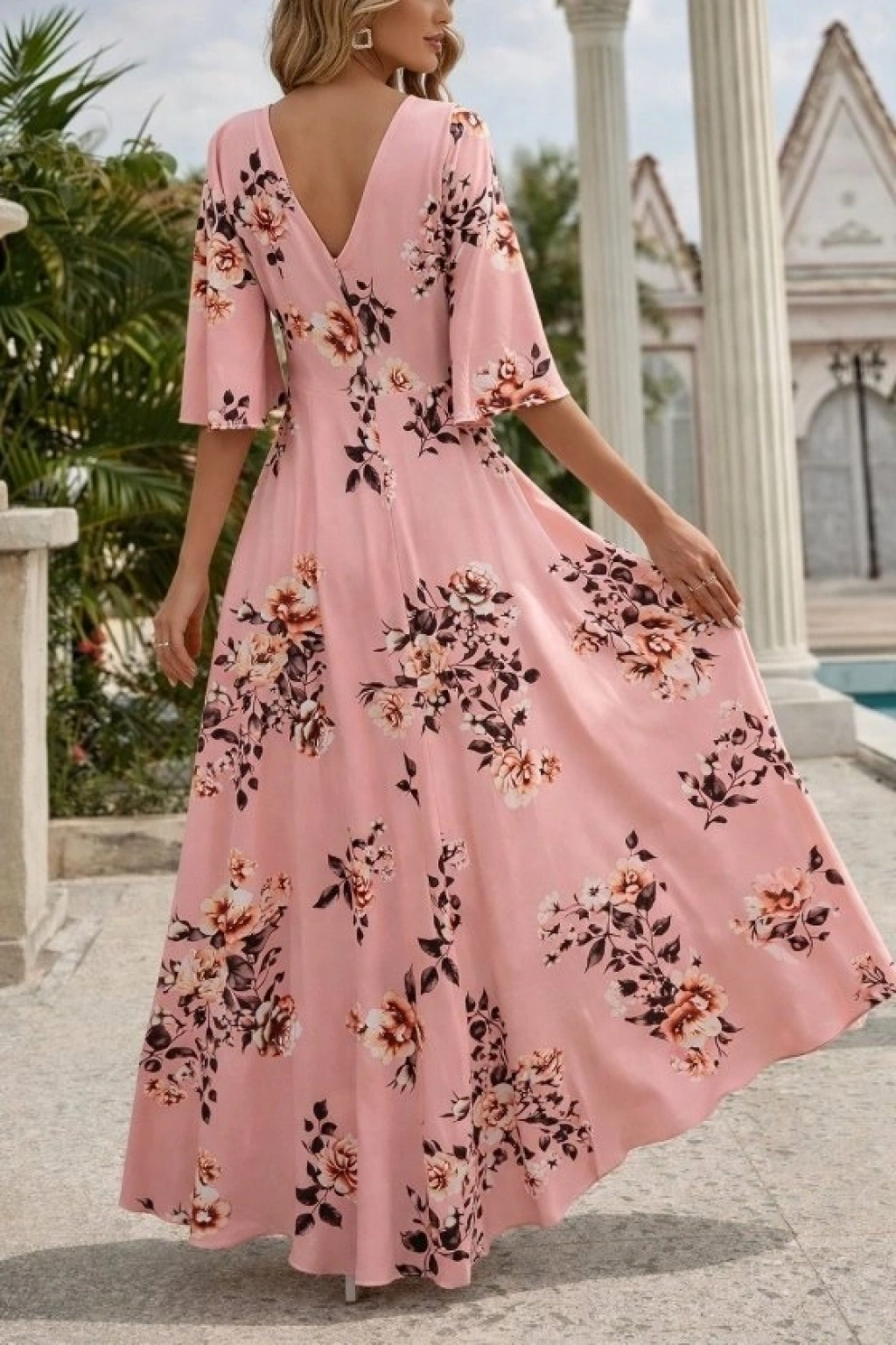 Kadın Kısa Kollu V Yakalı Desenli Süprem Elbise
