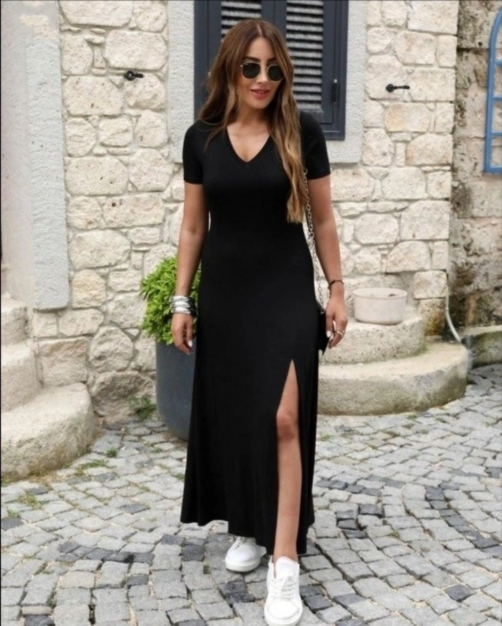 Kadın Kısa Kollu V Yakalı Maksi Boy Viskon Elbise