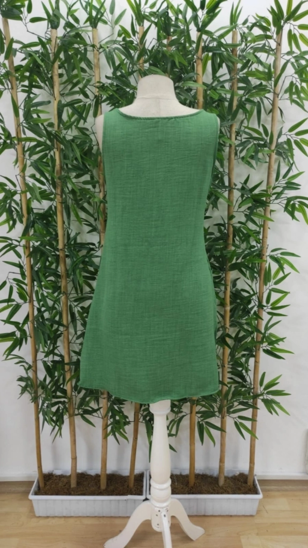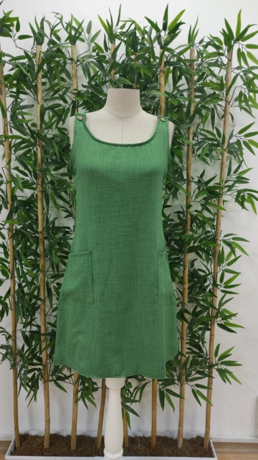 Kadın Kolsuz Kalın Askılı Düğme Detay Cepli Keten Elbise