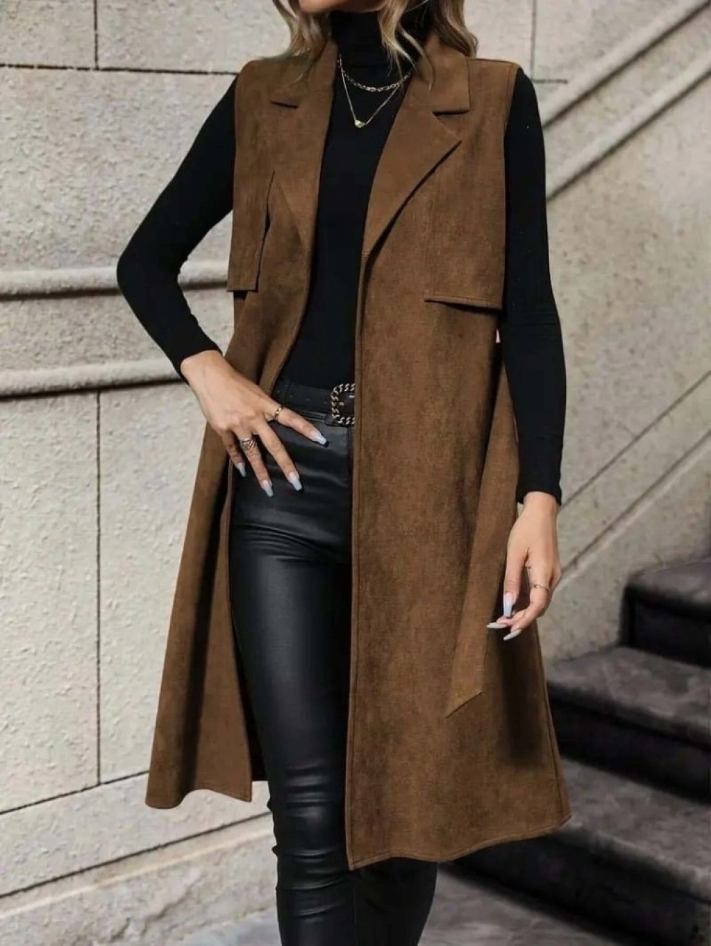 Kadın Kolsuz Yakalı önü Açık Belden Kuşaklı Süet Midi Yelek