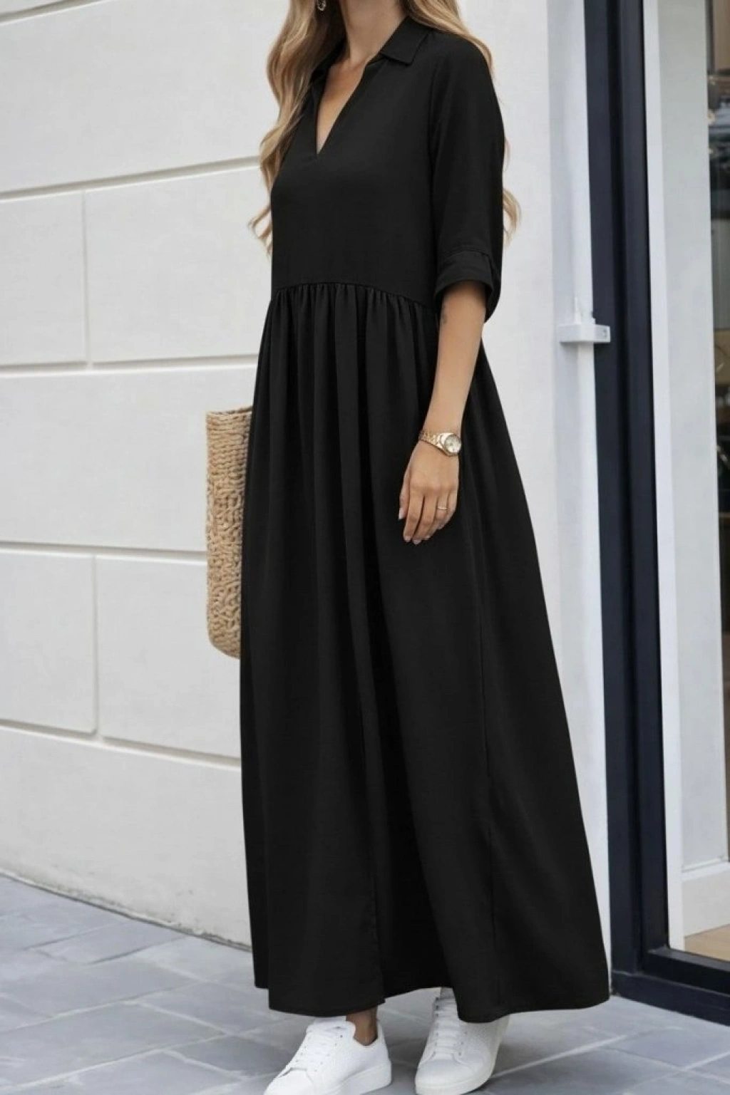 Kadın Truvakar Kollu V Yakalı Yırtmaçlı Uzun Aerobin Elbise