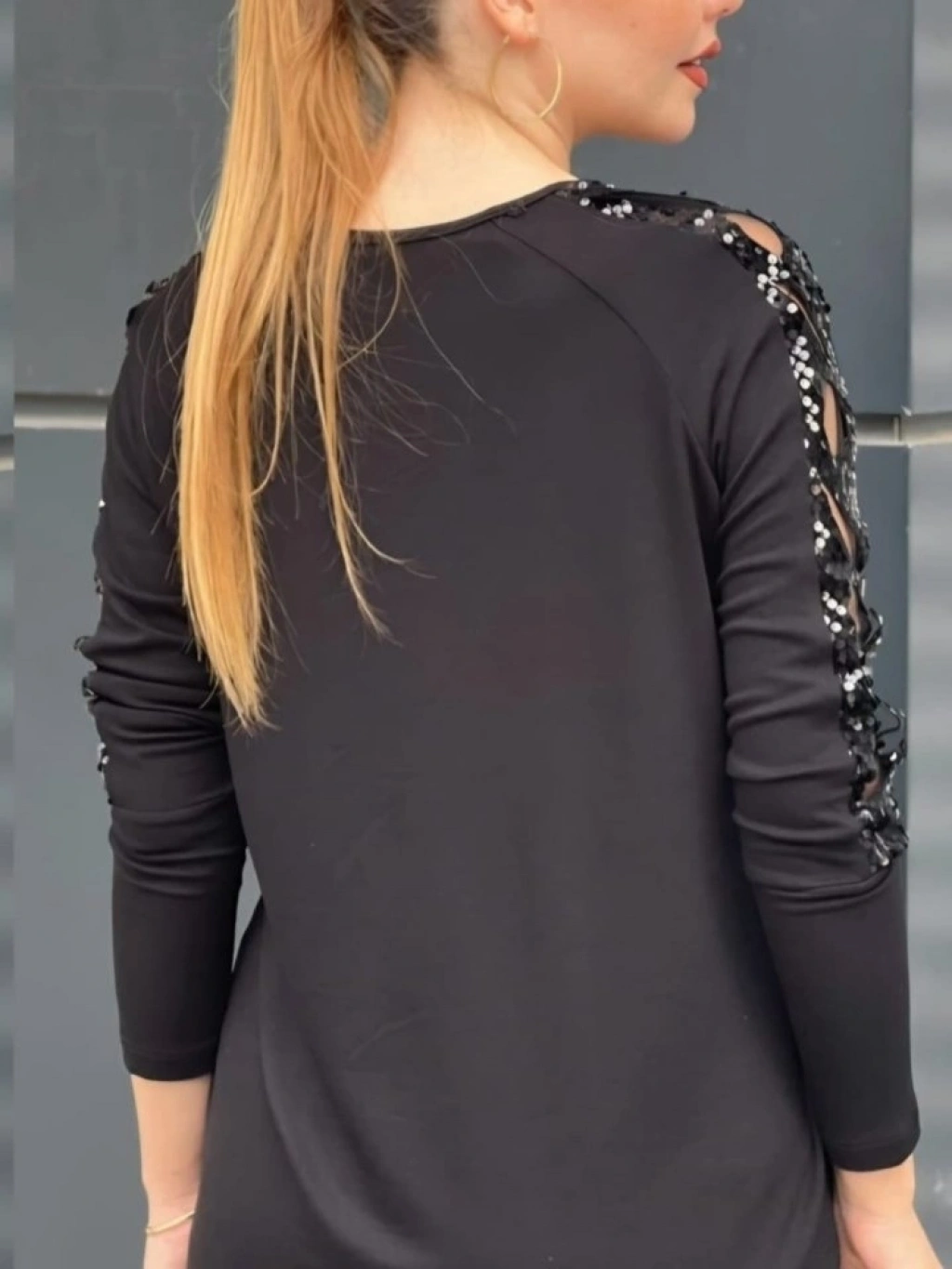 Kadın Uzun Kollu Kolları Lazer Kesim Pul Payet Detay Bluz