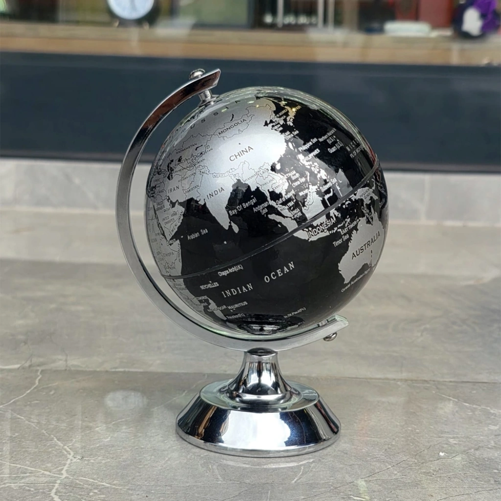 METAL AYAKLI SİYAH DÜNYA KÜRESİ Ürün ÖzellikleriÇalışma alanınıza derinlik ve zarafet katacak bir parça ile tanışın! Metal Ayaklı Siyah Dünya Küresi, klasik harita tasarımını modern bir renk paletiyle harmanlayarak mekanınıza prestij kazandırır. 16 cm yüksekliğindeki bu şık küre, yüksek kaliteli parlak metal ayağı ve birinci sınıf dayanıklı plastik gövdesiyle kaliteyi elinizde hissettirir. Siyah zemin üzerine gümüş tonlarda işlenmiş net ve detaylı harita baskısı, hem keşif ruhunuzu canlı tutar hem de dekorasyonunuzda odak noktası olur. 360 derece dönebilen standlı yapısı sayesinde dilediğiniz noktayı kolayca inceleyebilirsiniz. Minimalist, endüstriyel veya klasik; her türlü iç mekan stiline mükemmel uyum sağlayan bu dünya küresi, ofis masaları, kütüphane rafları ve modern salonlar için ideal bir aksesuardır. Hem iş arkadaşlarınız için etkileyici bir ofis hediyesi hem de kendiniz için şık bir dekoratif çözüm arıyorsanız, bu siyah küre asil duruşuyla en doğru tercih olacaktır.Ürün Teknik ÖzellikleriÖzellikAçıklamaYükseklik16 cmAyak MalzemesiYüksek Kaliteli Parlak Metal (Krom Kaplama)Küre MalzemesiDayanıklı Birinci Sınıf PlastikRenk TemasıSiyah Üzeri Gümüş Detaylı Modern StilTasarımÖzel Detaylı, Standlı ve 360 Derece DönebilirKullanım AlanıOfis Masası, Ev Dekorasyonu, Kütüphane AksesuarıBaskı KalitesiYüksek Çözünürlüklü, Net ve Kaliteli DetaylarPaket İçeriği1 Adet Metal Ayaklı Siyah Dünya Küresi