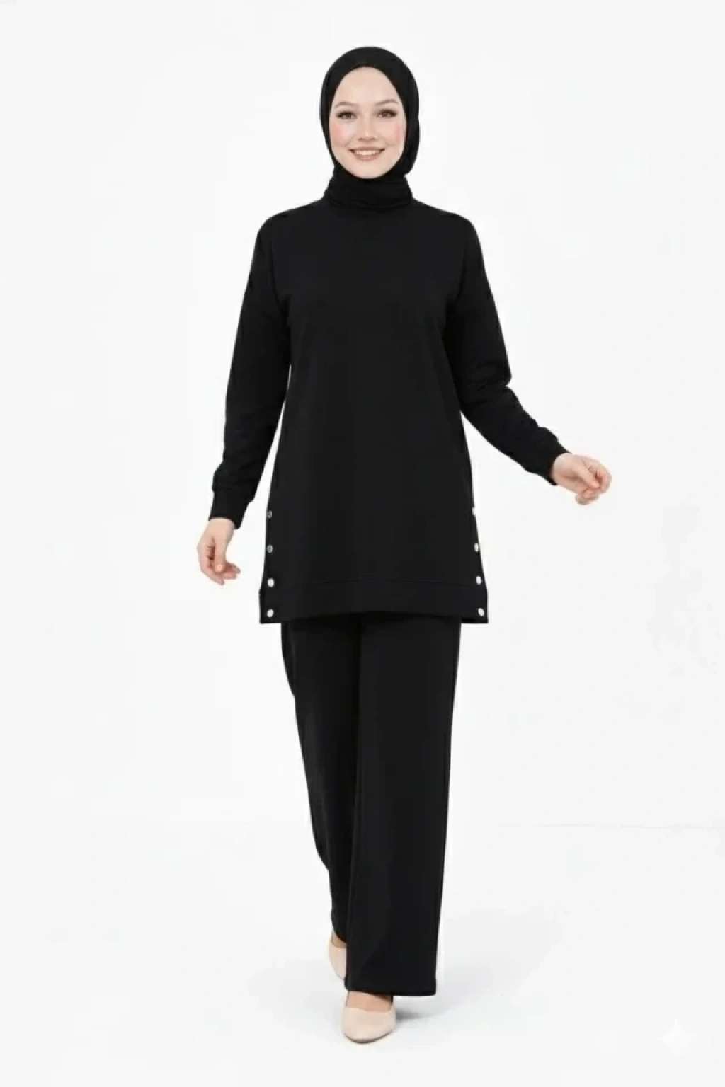 Osy Modal Yumuşak Dokulu Kumaş Modern Tesettür Takım Yandan Metal Çıtçıtlı Uzun Tunik Pantolon Set Salaş Kalıp - Siyah