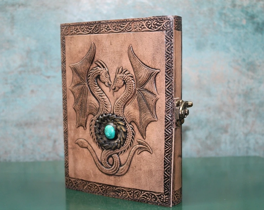 TAŞLI DERİ DEFTER MODEL 8Ürün ÖzellikleriTaşlı Deri Defter Model 8, ejderha işlemeli tasarımı ile dikkat çeker. Ejderha figürü, güç ve bilgeliği simgelerken, taşlarla süslenmiş kapak tasarımı ise defteri daha da özel kılar. Deri kapak üzerine işlenmiş ejderha figürü, mistik ve fantastik bir havası olan defteri görsel olarak etkileyici hale getirir. 20x15 cm ölçülerindeki ideal boyutu, günlük kullanım için oldukça uygundur ve yazı yazarken rahatlık sağlar. Hem kişisel kullanım hem de hediye olarak harika bir tercihtir.Paket İçeriği1 adet Taşlı Deri Defter Model 8